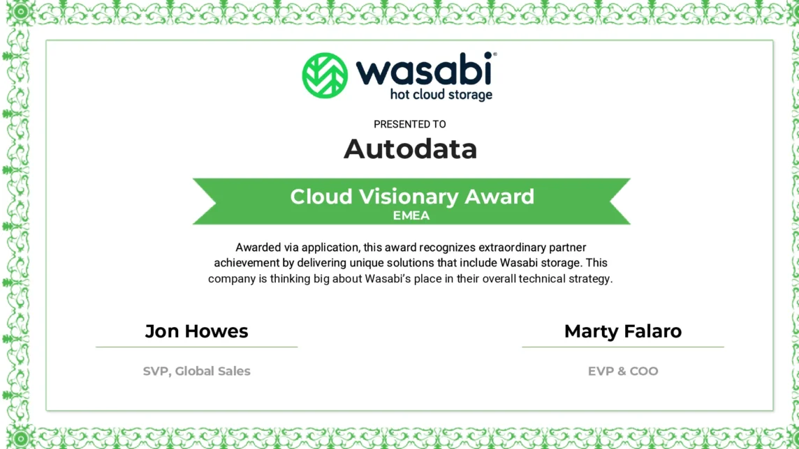 “We are delighted to receive this award and recognition from Wasabi, one of our key solutions partners,” said Dominic McLoughlin, Sales Director, Autodata.